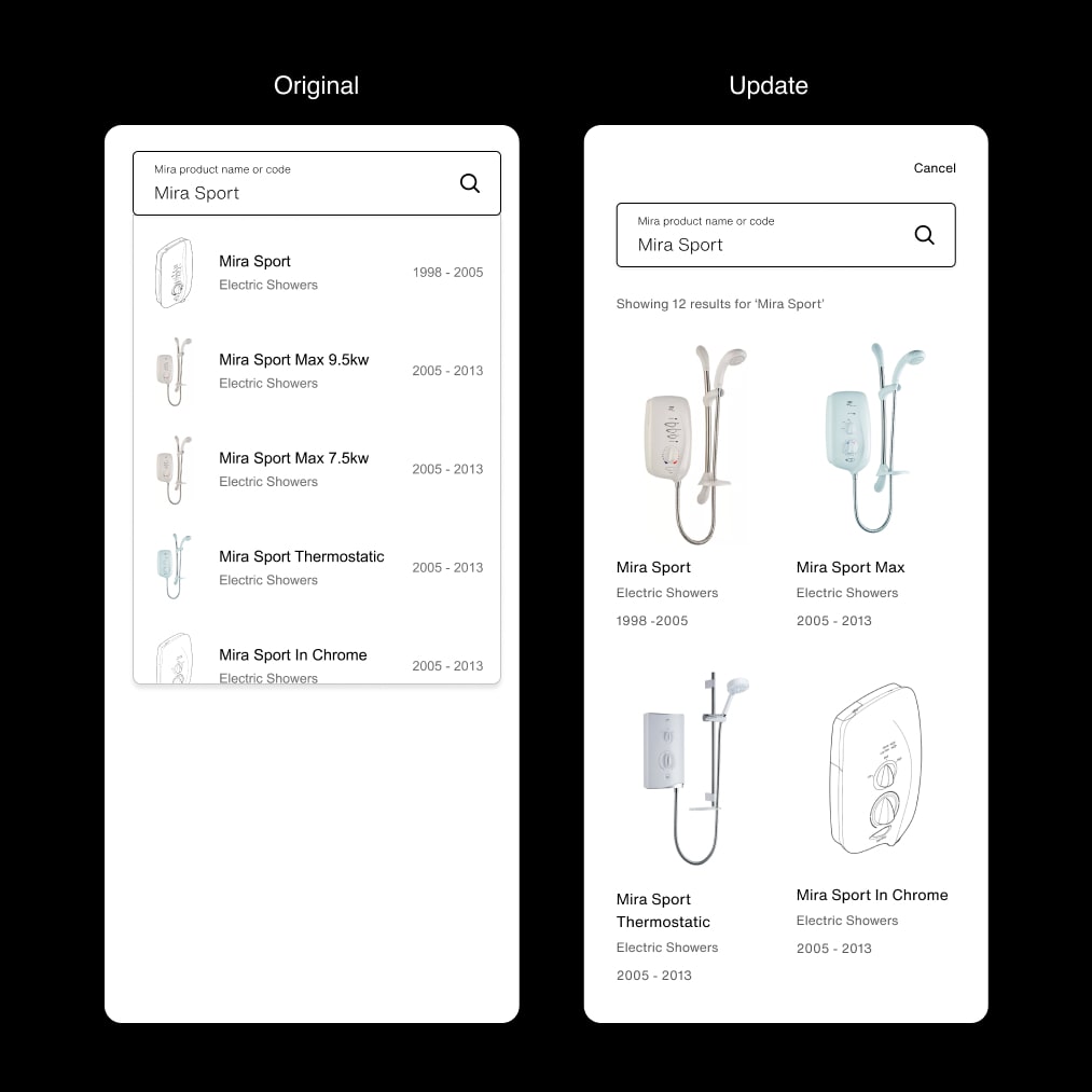 When observing usability studies I noticed that participants struggled to select their shower because the image was so small. They couldn’t easily distinguish if it matched the shower in their house. I redesigned the listing page to put more emphasis on the product image. This reduced errors on this step by 38%.